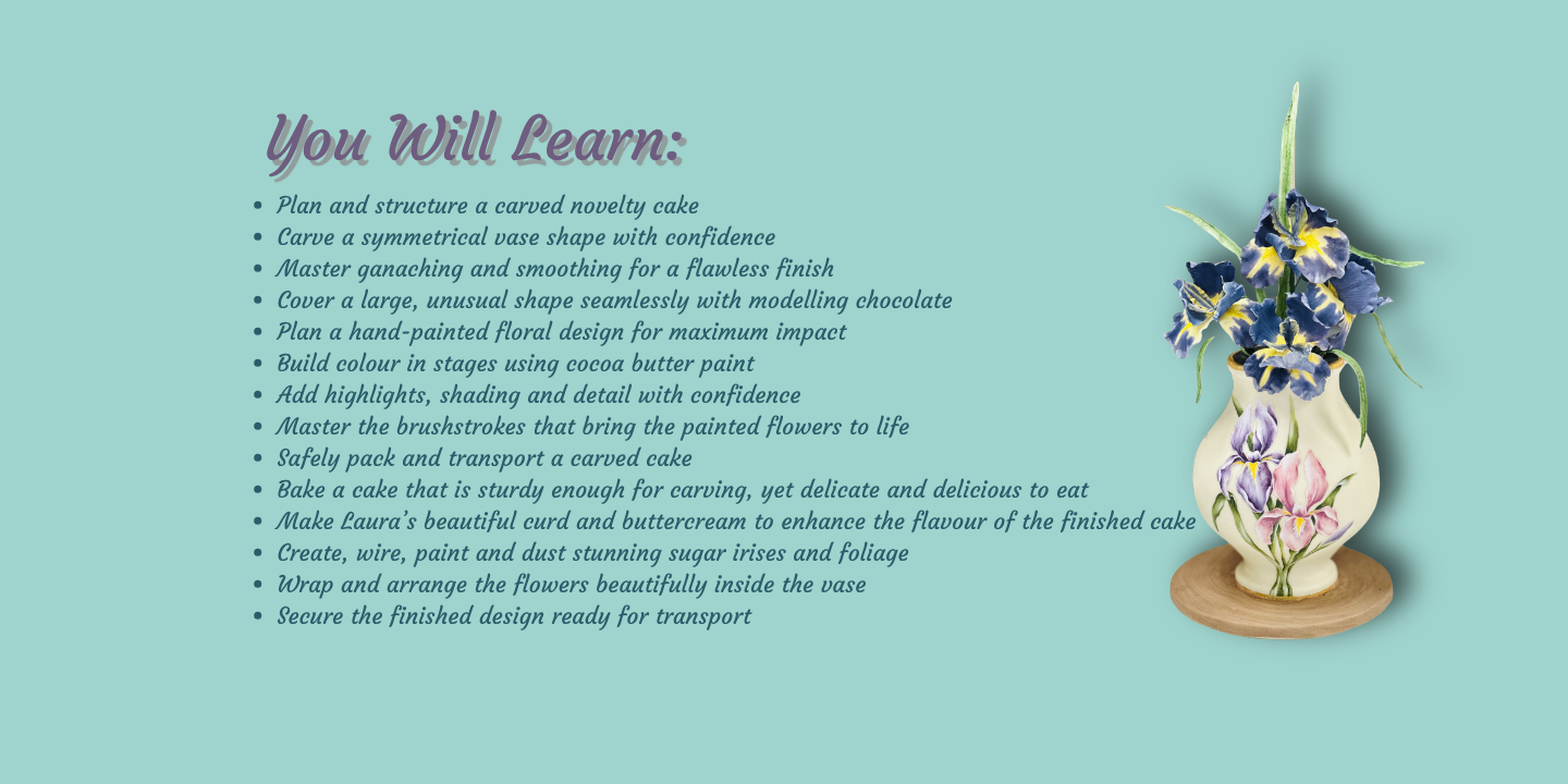 Learn how to plan, structure and carve an elegant vase-shaped cake with confidence. Dawn takes you step by step through carving, ganaching, smoothing and seamlessly covering an unusual shape with modelling chocolate for a flawless professional finish.